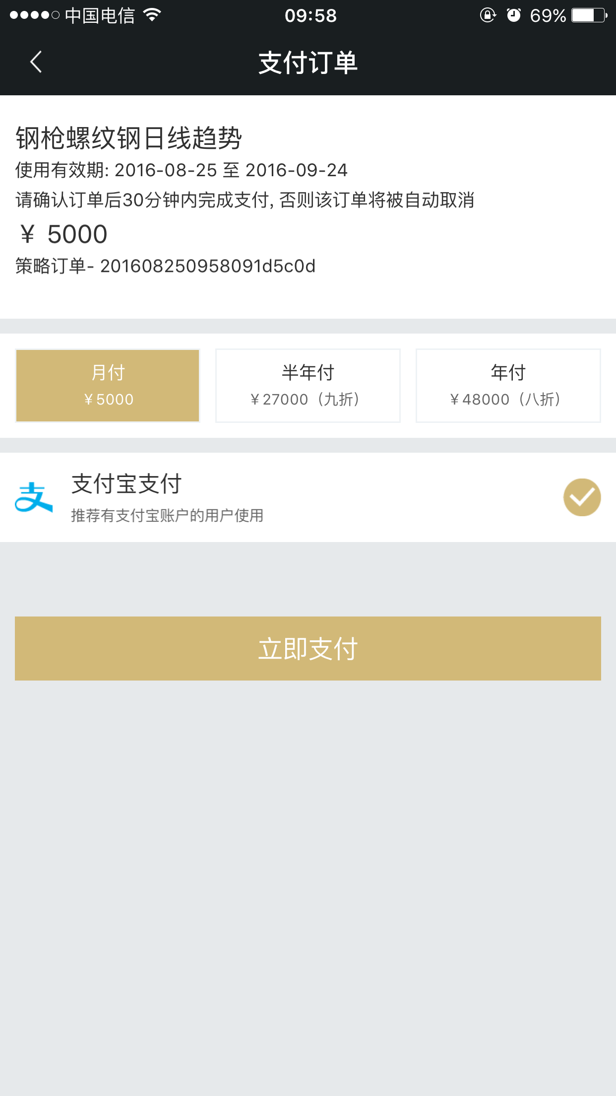 用户选择喜欢的策略,即可线上支付(支持支付宝付款),即时购买!
